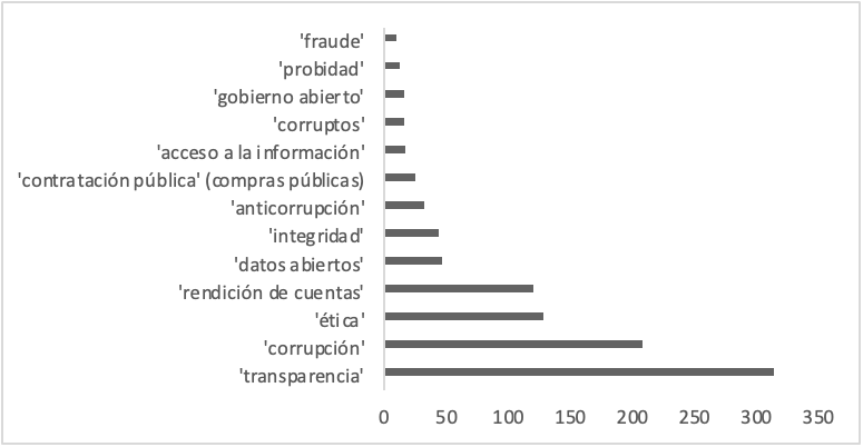 El conteo de menciones a doce palabras clave evidencia que los términos más frecuentes son transparencia (31%), corrupción (21%) y ética y rendición de cuentas (12% cada uno). Mientras que conceptos como probidad, integridad o gobierno abierto aparecen de forma marginal.